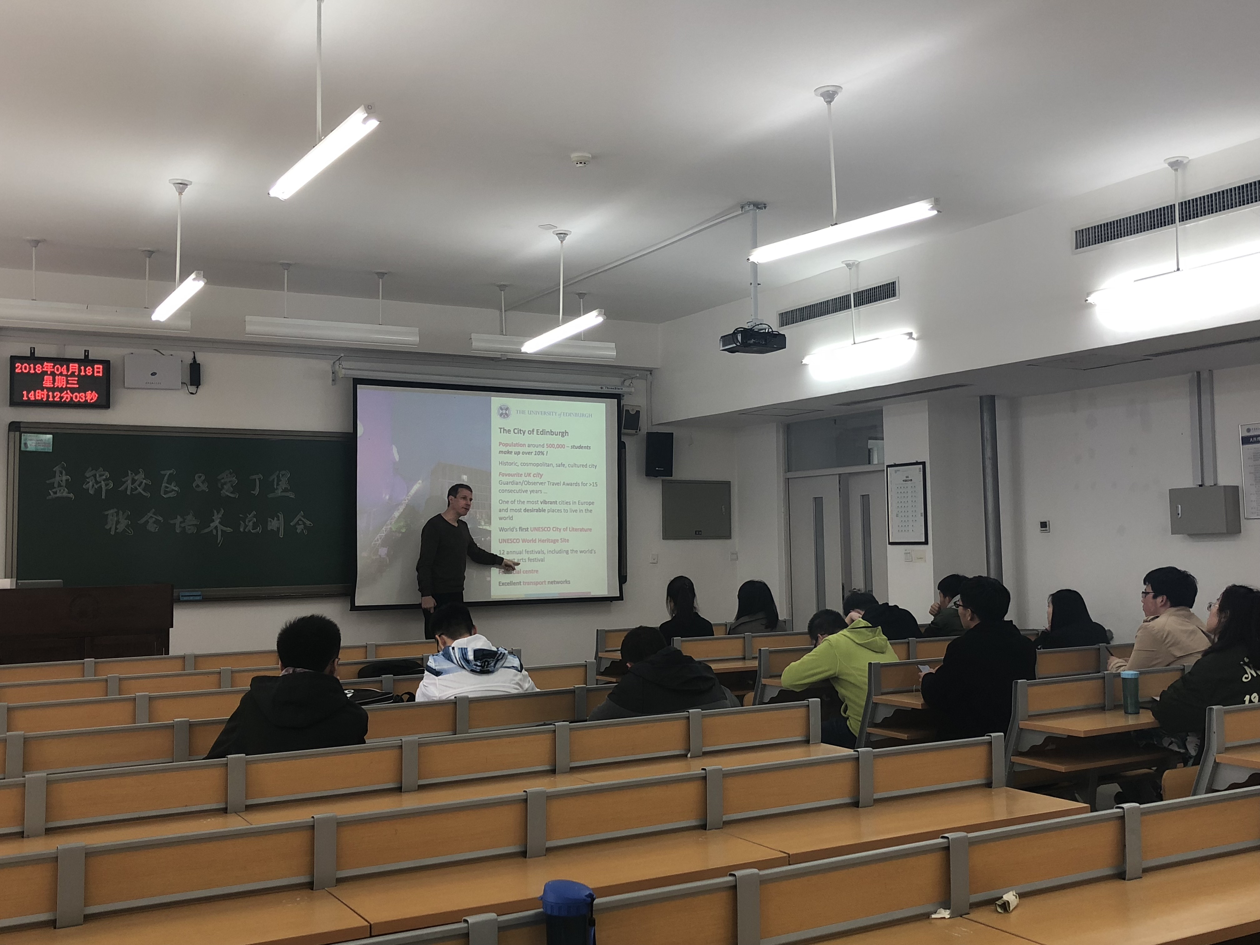 为进一步宣传爱丁堡大学与我校的合作办学项目,增进学术交流,2018年4月18日,爱丁堡大学化学学院教师代表Dr.Uwe Schneider访问盘锦校区,为我校学生做了合作项目宣讲介绍。
