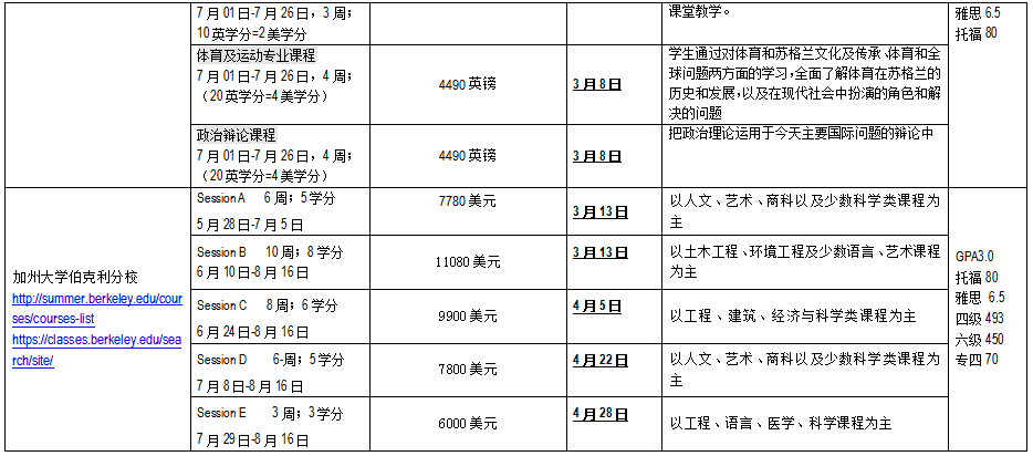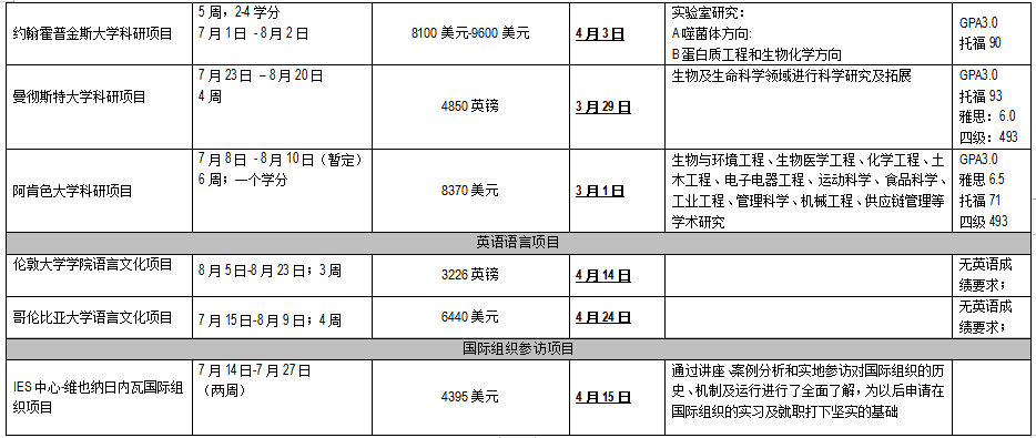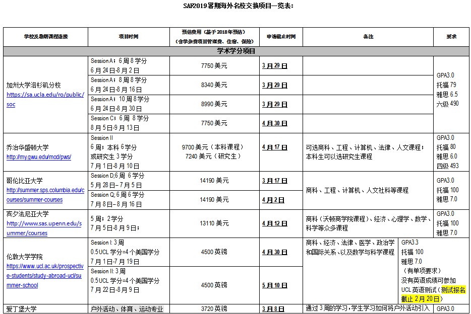 一、SAF2019暑期海外名校交换项目一览表: